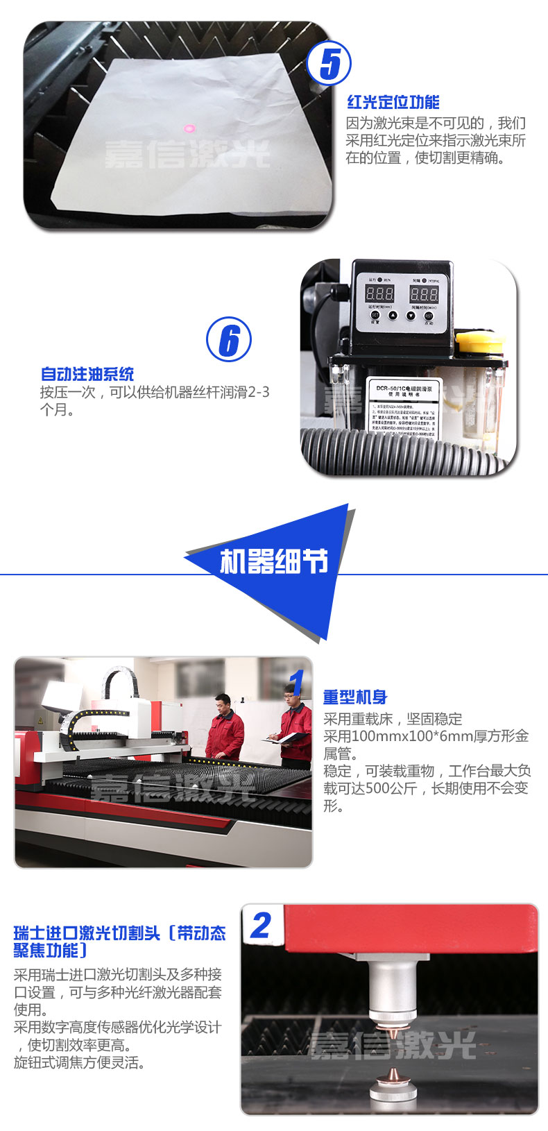 1000w光纖切割機是嘉信激光旗下主打產品,包含整體龍門式結構,高強度德國激光器,日本進口伺服電機,精密直線導軌和滾珠絲杠傳動系統,具有剛性高、穩定性強、加工質量高等特點。