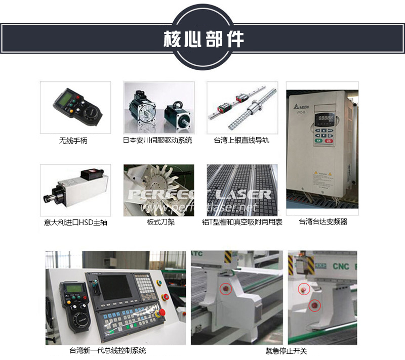 11.鋁型材T型槽與真空吸附兩用臺面:配備真空吸附、吸塵器裝置,六分區真空吸附臺面針對密度板等軟質材加工設計,也可放置不同大小的板材,保持板面的平整度,使刻出來的效果圖深淺一致,提高了加工以外的板材裝卸時間;吸塵系統可在加工過程中吸走木屑及碎沫,保持工作臺清潔,對設備進行了保養。