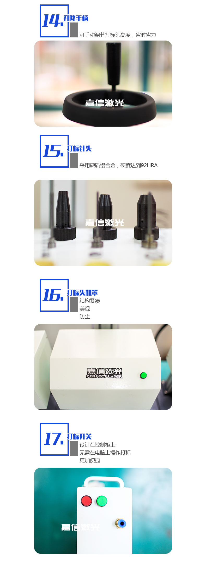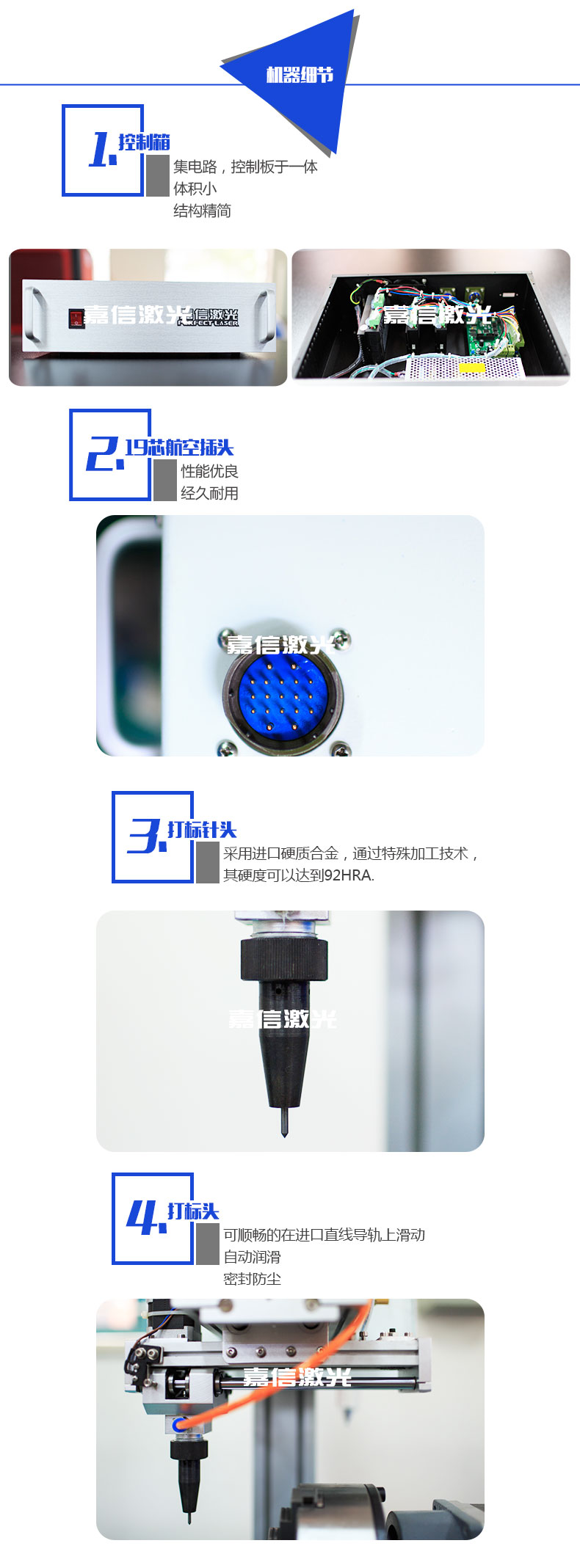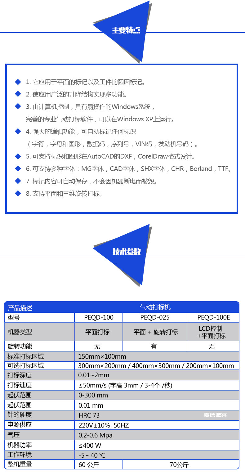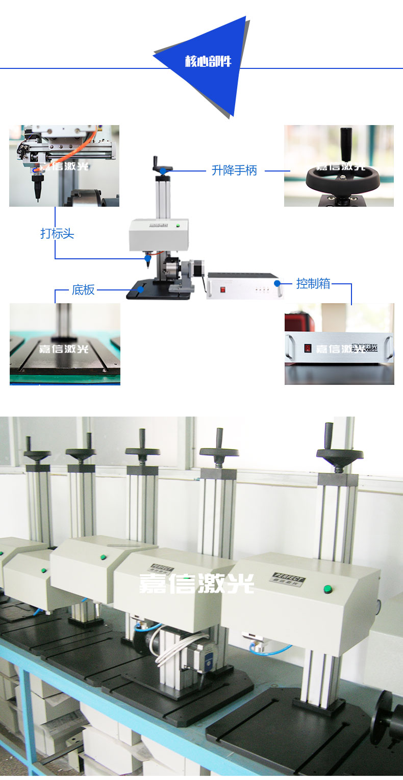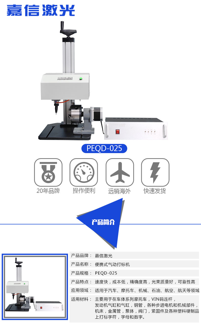 嘉信激光的旋轉氣動打標機同時支持平面打標和旋轉打標。旋轉氣動打標機可以使工件上的標志,字符,字母,VIN碼,序列號,日期和圖形長久性存在,不可擦除,也可用于金屬和一些硬質塑料的標記。