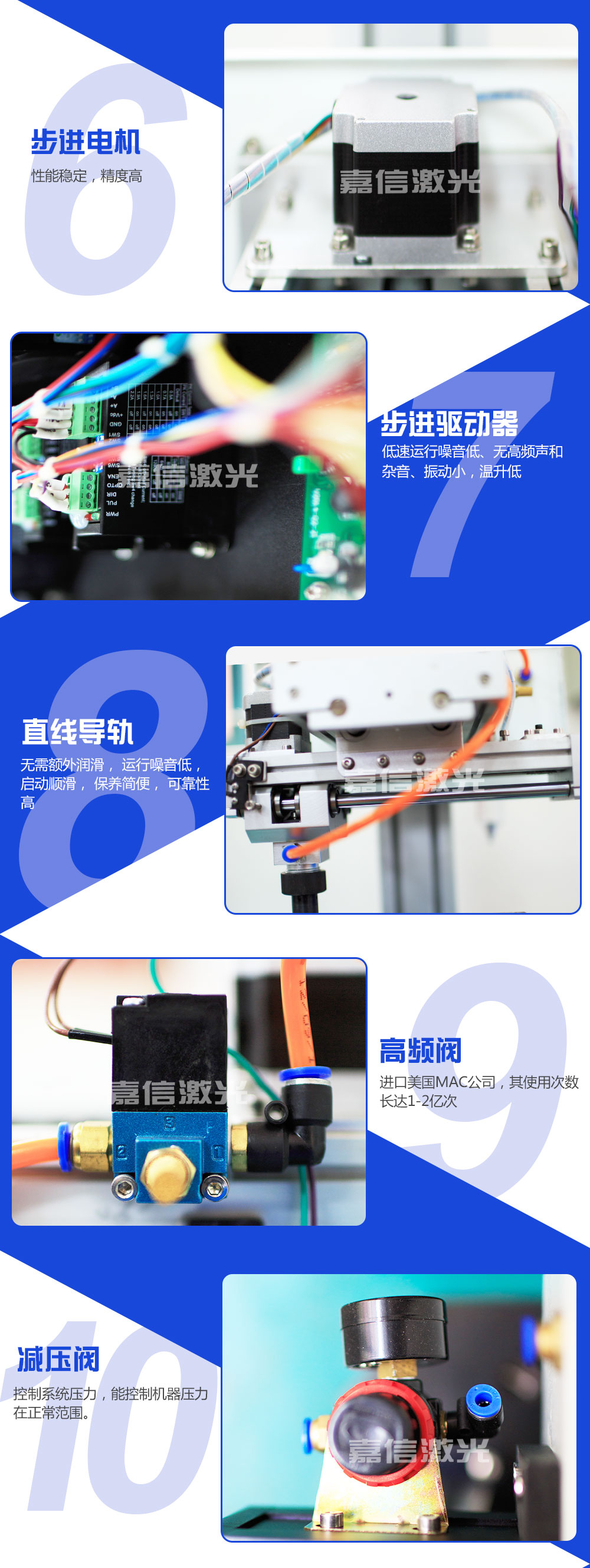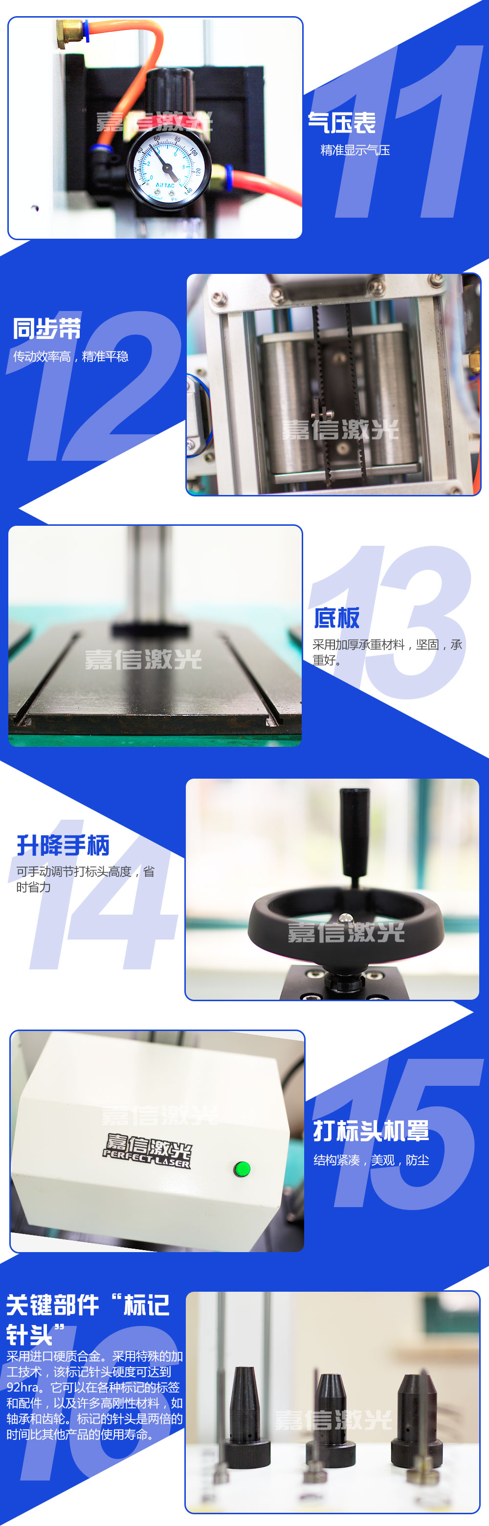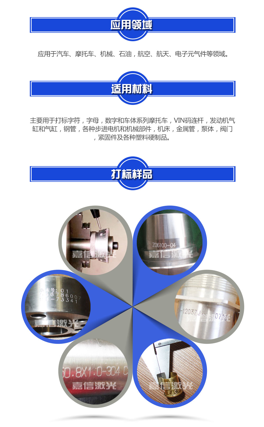 嘉信激光設(shè)計(jì)生產(chǎn)的旋轉(zhuǎn)氣動(dòng)打標(biāo)機(jī)技術(shù)成熟,運(yùn)行穩(wěn)定。在世界各地,每天都有無數(shù)臺(tái)嘉信激光的旋轉(zhuǎn)氣動(dòng)打標(biāo)機(jī)正安全、良好地運(yùn)行著,它們廣泛應(yīng)用于鋼鐵冶金、有色金屬、汽車及零部件、航天航空、軍工電子、精密儀器儀表、機(jī)械制造、模具、五金工具、集成電路﹑半導(dǎo)體制造、太陽能、教育、通訊與測量、包裝、鞋材皮革、 塑料橡膠、珠寶首飾、工藝禮品等各個(gè)行業(yè),為世界各地用戶提供者優(yōu)良的品質(zhì)和服務(wù)。