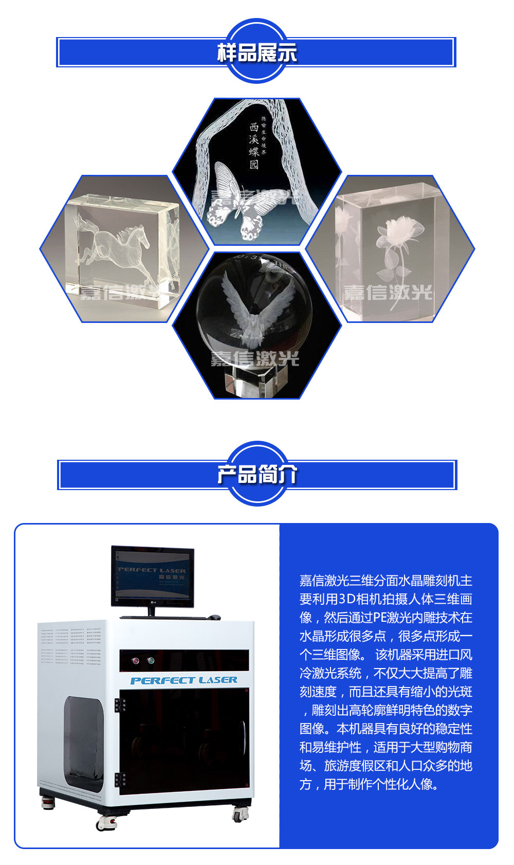 隨著科技的發展,3D技術改變了人們對于物體的觀察角度,使得產品更加具體真實,有互動性。而激光行業中3D光學內雕技術使得3D快速成像成為可能。嘉信激光PE-DP-A系列3D水晶內雕機瞄準于水晶快速成像市場,低成本,高產出,穩定性好,易于數字圖像維護,特別適合在大型商超,度假區等地方的個性化人像的制作,是個人創業投資的理想伙伴。