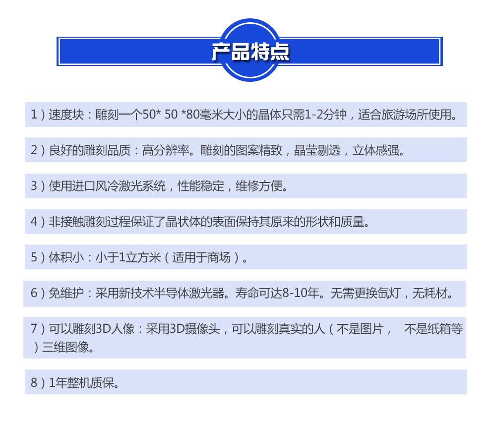 2.智能化操作:3D水晶內雕機采用激光自準直技術和閉環監控系統,24小時連續運轉工作,圖像內雕刻“零寬度”拼接技術,人性化的系統控制和監控操作設計,一鍵式完成雕刻工作,避免人為操作失誤。