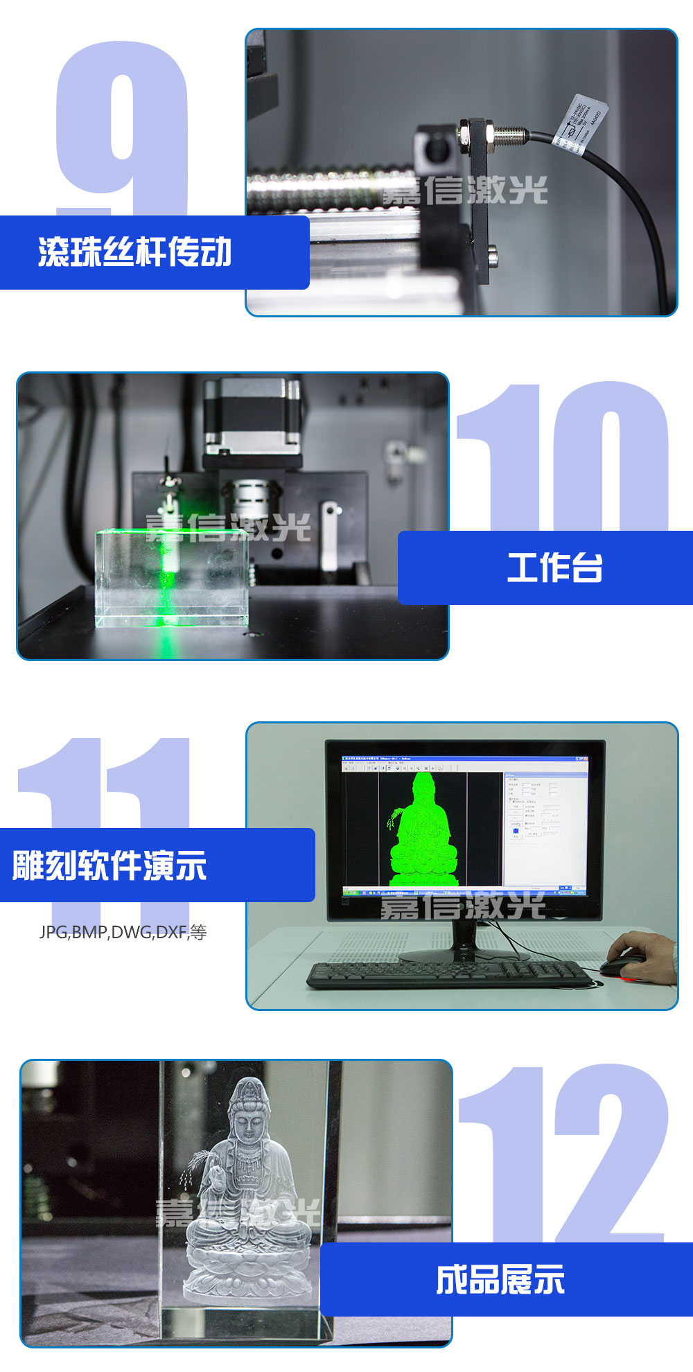 嘉信激光PE-DP-C系列工藝品水晶3D內雕機采用進口激光器材,公司設計的控制系統,將立體三維圖案雕刻在水晶玻璃亞克力等透明材料內部,雕刻效果精美,成像細膩均勻,標記持久,無粉塵無污染,支持DXF,ASC,BMP等格式。
